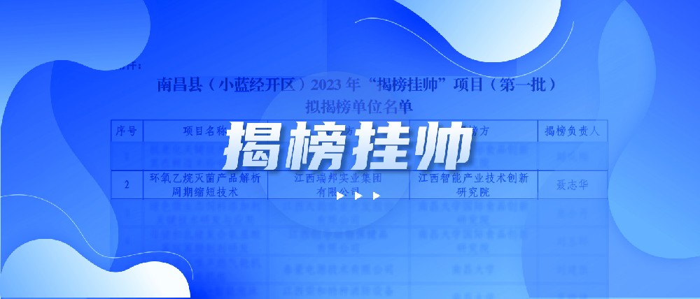 日前,南昌县(小蓝经开区)发布2023年“揭榜挂帅”企业重大技术需求,通过“揭榜挂帅”来吸引优质科技创新资源,实现创新链、人才链和产业链精准对接,助力破解制约高质量发展的难题。江西智研院成功揭榜江西瑞邦实业集团有限公司“环氧乙烷灭菌产品解析周期缩短技术”项目。 &nb...