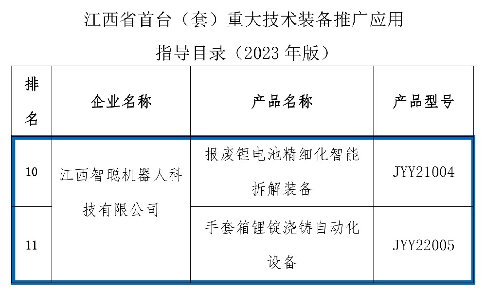 硕果飘香佳绩传。日前,江西省工信厅公布《江西省首台(套)重大技术装备推广应用指导目录(2023年版)》,研究院全资子公司江西智聪机器人科技有限公司自主研发的——“报废锂电池精细化智能拆解装备”以及“手套箱锂锭浇铸自动化设备”成功入选。 凭借自动化...