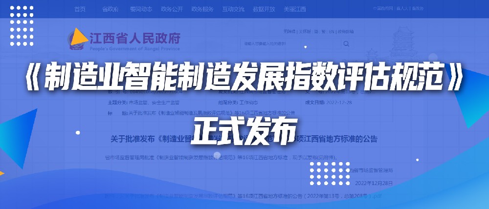 12月28日,由江西省工业和信息化厅提出的江西省地方标准《制造业智能制造发展指数评估规范》(DB36/T 1724-2022)正式发布,并将于2023年7月1日开始实施。这是我省首部智能制造地方标准,包括评估体系、程序、内容、方法和应用等。江西智研院作为该标准的主要起草单位,全程参与了标准的编制工作。...