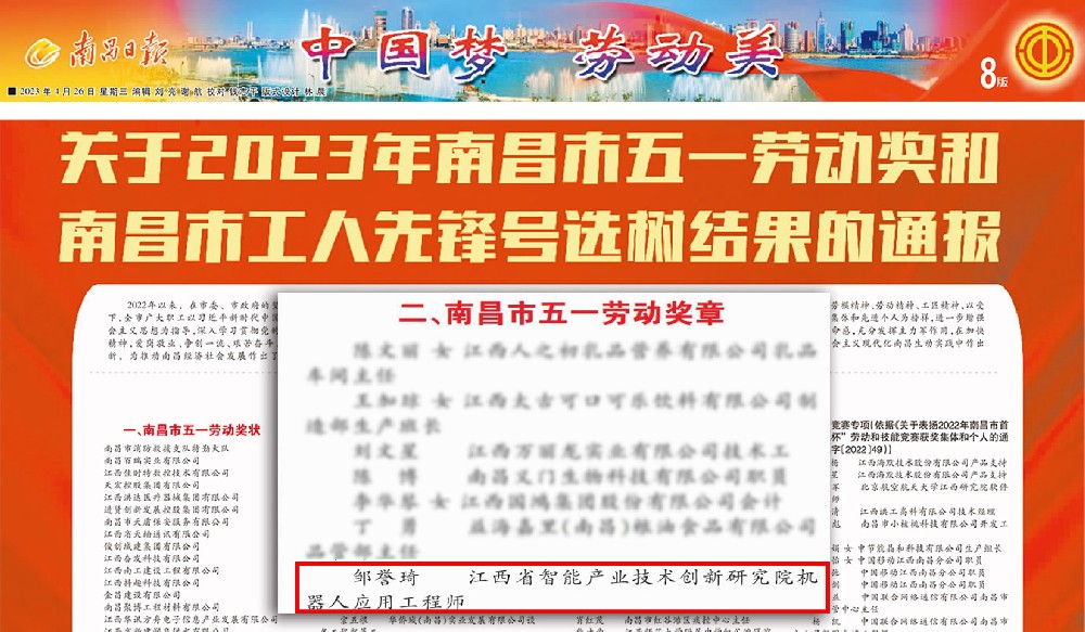日前,南昌市总工会隆重举行了2023年南昌市五一劳动奖和工人先锋号表彰大会。江西智研院邹誉琦同志凭借突出的工作能力、优异的成绩,以及积极向上的敬业精神,荣获2023年南昌市五一劳动奖状、奖章。 邹誉琦,男,32岁,中共党员,担任江西智研院机器人应用工程师。邹...